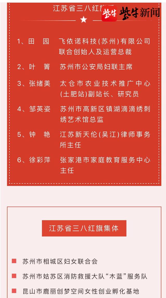 扬子晚报网3月7日讯(记者 顾剑钧)近日,全国妇联公布了2020年度全国三八红旗手标兵、红旗手(集体)。中国科学院苏州生物医学工程技术研究所研究员、副主任崔锦江被评为全国三八红旗手,苏州市中级人民法院未成年人案件综合审判庭集体被评为全国三八红旗集体。