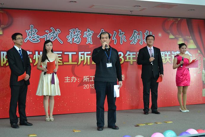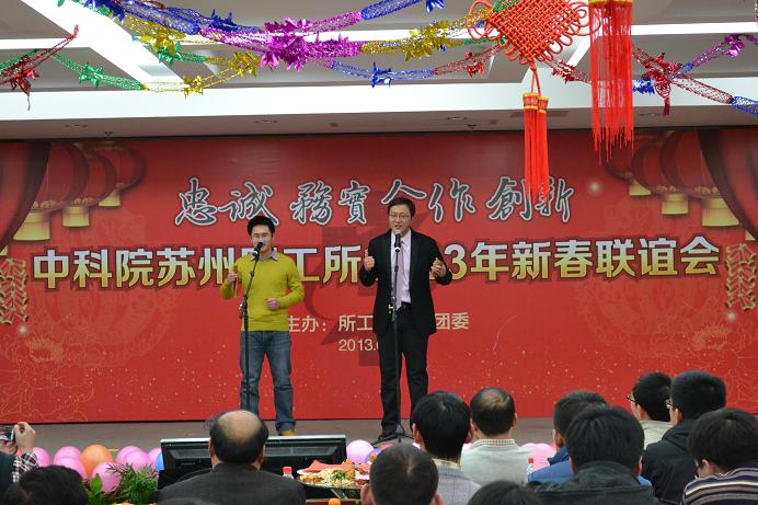 所党委书记、副所长邓强首先在联谊会上致辞,他代表所党政领导班子,向全所职工、在学研究生及家属致以新春的祝福和诚挚的问候。他说,2012年对于苏州医工所来说意义深远、值得铭记:我们圆满完成四年的筹建任务,顺利通过验收,正式成为中科院序列研究所;承载着中科院、地方领导的重托和全所职工的厚望,首届所党政领导班子走马上任;根据未来发展需要,凝练了学科布局,调整了组织机构,初步探索了本所发展的模式、机制和理念。他希望全所职工团结一致,心往一处想,劲往一处使,拧成一股绳,为本所的发展谱写更加华美的篇章。