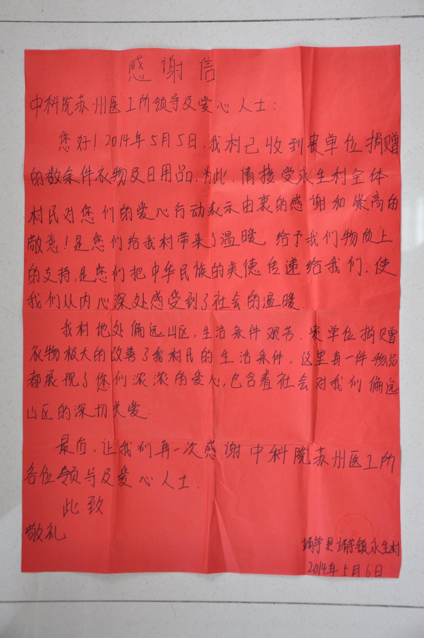 活动通知发出后,得到了全所职工和研究生的积极响应和参与,短短一周时间,共收到各类捐赠衣物1000余件。活动志愿者利用周末休息时间对所有衣物进行了集中消毒、分类和打包,并将其分别寄往早已联系好的山东东平县、四川阿坝县、甘肃会宁县、吉林靖宇县等地区的贫困村庄和学校,并收到了感谢信。