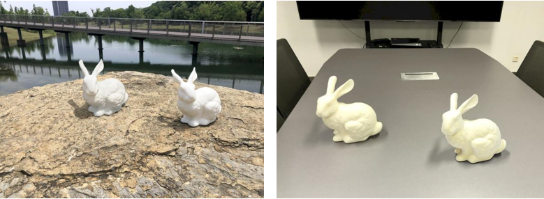 图片描述:本作品展示的是面向混合现实领域中的基于光照估计的虚实融合技术。为了提高渲染物体的真实感,我们通过计算真实场景中的实际光照,将计算机渲染的虚拟物体与包含3D打印模型的真实场景相融合,达到以假乱真的效果。每张图片中都分别包含一真一假的模型,其中在左图中,右侧兔子为真模型;右图中,左侧兔子为真模型。本作品有利于提高渲染物体的真实感,增加用户的沉浸感,对于未来元宇宙的普及有着重要意义。