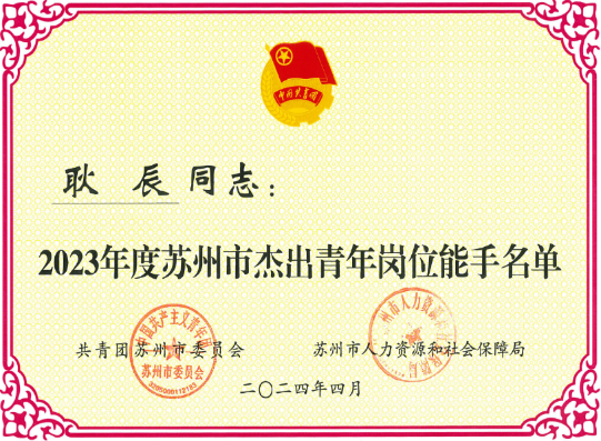 近日,共青团苏州市委员会发布了《关于授予2023年度苏州市杰出青年岗位能手称号的决定》(团委函〔2023〕34号),中国科学院苏州生物医学工程技术研究所副研究员耿辰同志因其在岗位上的卓越表现和杰出贡献被授予“2023年度苏州市杰出青年岗位能手”荣誉称号。该荣誉由共青团苏州市委员会、苏州市人力资源和社会保障局颁发,每年评选10名,旨在表彰在各行各业中发挥示范引领作用的杰出青年。