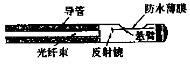 光纤体压计可以测量人体内各部位的压力,如膀胱、尿道和直肠等部位的压力,甚至颅内和心血管(尤其是动脉和心室)压力也可以用光纤体压计来测量。图2为一种医用光纤体压计探针结构图,其中对压力敏感的部分是在探针导管末端侧壁上的一块防水薄膜。一面带有悬臂的微型反射镜与薄膜相连。反射镜对面是一束光纤,用来传递入射光到反射镜,同时也将反射光传送出来。当薄膜上有压力作用时,薄膜发生形变且能带动悬臂使反射镜角度发生改变。从光纤传来的光束照射到反光镜上,再反射到光纤的端点。由于反射光的方向随反射镜角度的变化而改变,因此光纤接收到的反射光的强度也随之变化。这一变化通过光纤传到另一端的光电探测器变成电信号,这样通过电压的变化便可知探针处的压力大小[6]。