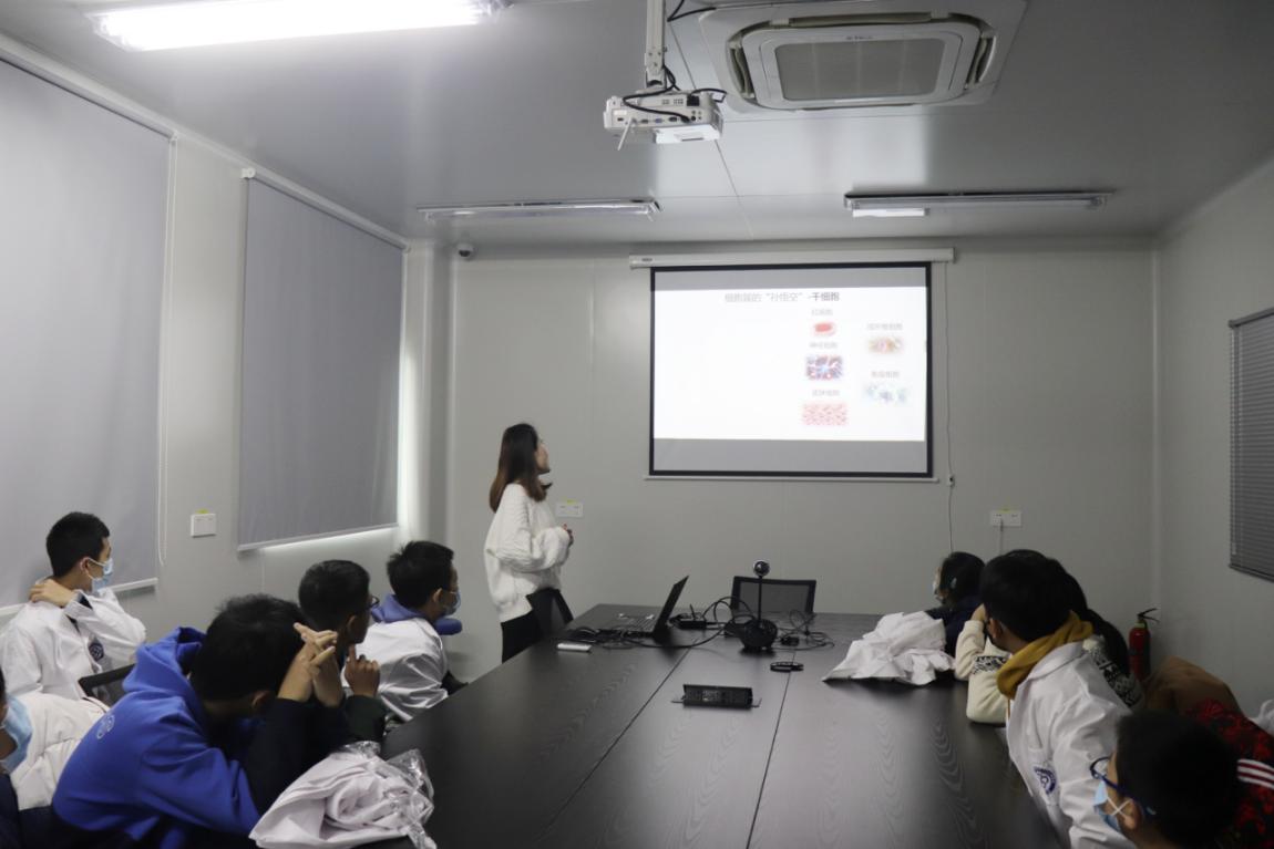 在参观了细胞工程研究中心的整体工作区域,对中心的工作环境有所了解之后,中心的老师给学生们带来了一场妙趣横生的干细胞科普讲座。讲座中,学生们了解了干细胞的概念、干细胞的作用机制、目前国内外干细胞的应用、干细胞技术未来的发展方向以及目前细胞中心的研发方向。除了幻灯片演示讲解,老师还引用了专家论坛、视频资料、影视文学等多方面资料,帮助学生们能够更加直观的理解干细胞研究的重要意义,内容既具科普专业性,同时又不失趣味性,让学生们在轻松的氛围中学习到干细胞相关的科学知识。在讲座的最后环节,学生们都对于干细胞技术的应用方面十分好奇,主动向老师提出问题并参与讨论,大家也纷纷表示讲座内容十分生动有趣,激发了他们对于生物医学先进技术的兴趣。