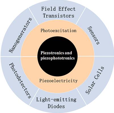图1. 压电方法学在传感器、场效应晶体管、发电机、光电探测器、发光二极管等方面的应用。
