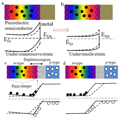 近年来,材料科学与技术发展迅速,在产业化方面已经取得了长足进展。压电材料是指一类具有压电效应的功能材料,可用于传感器、换能器、电声器件、滤波器、微位移驱动器等,在能源、医疗等领域得到了广泛的应用。当具有非中心对称性的结构材料受到外加应力时,由于晶体中离子的极化而在材料内产生压电电势。压电半导体材料最显著的特点是同时具有压电和半导体特性,所以晶体中产生的压电势可显著影响界面/结区的载流子传输。基于压电半导体材料制备的器件可以利用压电势调控载流子传输过程,从而提高相关器件如传感器、光电探测器、太阳能电池和发光二极管等光电器件的性能,在人机接口、机器人传感和驱动、智能化与个人化的电子签名、智能微纳机电系统等科学等领域已经显现出了市场应用价值。综上所述,如何利用压电材料实现优越的器件性能一直是研究者追逐的热点。
