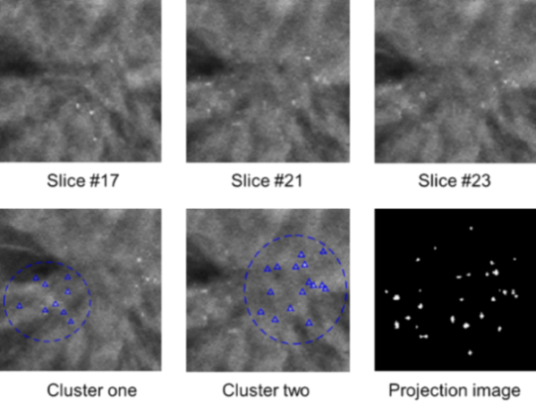 近期,苏州医工所医学影像室先进成像课题组开发了一套乳腺DBT影像的微钙化簇自动检测算法。该算法采用三维的图像处理技术,实现了微钙化点的增强、定位和分割,通过聚类得到微钙化簇。针对微钙化簇在DBT影像的非中间层存在图像模糊,以及分布于多层的影像特点,该课题组创新性的提出在中间层切片和最大密度投影层实现微钙化簇的检测。针对微钙化簇检测的高假阳性率,提出了基于多域影像特征的假阳性降低算法,相关成果已申请发明专利(基于多域特征的数字乳腺X射线断层摄影图像的微钙化簇自动检测方法,201910031535.8)。
