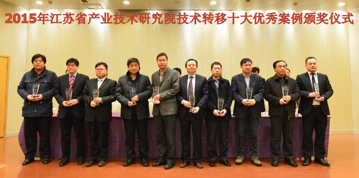 为鼓励和表彰入选十大优秀案例的专业研究所,在1月21日举行的省产研院年度总结大会上举行了颁奖仪式。江苏省科技厅厅长王秦,江苏省产业技术研究院院长欧阳平凯,执行院长刘庆,副院长胡义东,院务委员李健民,副院长李世收,副院长何利文,分别为各专业研究所颁发奖杯以资鼓励。在颁奖仪式上,生物医学工程技术研究所(以下简称“专业所”)所长杨洪波从江苏省科技厅厅长王秦手中接过奖杯,并表示,2016年专业所将再接再厉,切实做好技术转移工作,为江苏产业转型升级做出更大的贡献。