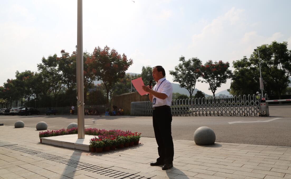 上午九点,升旗仪式正式开始,旗手们迈着整齐有力的步伐,护送着国旗步入升旗仪式现场。伴随着雄壮的国歌声,五星红旗冉冉升起,全体人员庄严肃穆,高唱中华人民共和国国歌,向国旗行注目礼。