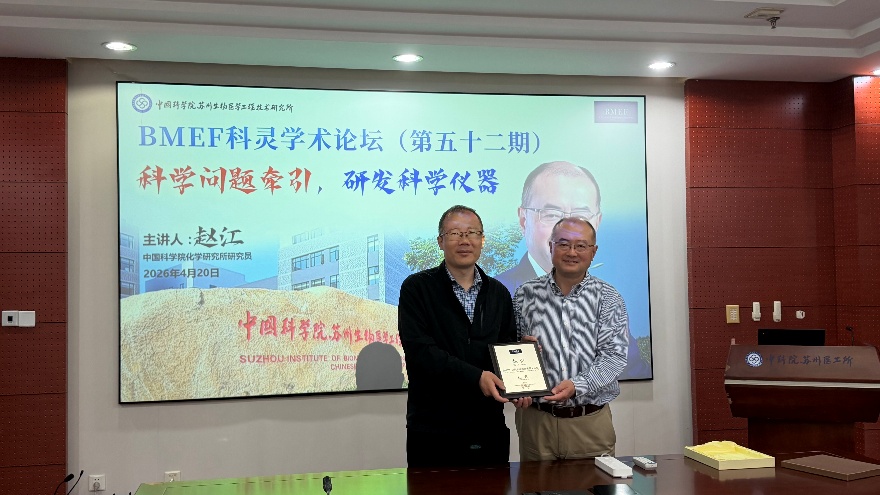 2026年4月20日上午,中国科学院苏州医工所举办第五十二期“BMEF科灵学术论坛”。邀请本期论坛特邀中国科学院化学研究所研究员、国家杰出青年科学基金获得者赵江担任主讲嘉宾,作题为“科学问题牵引,研发科学仪器”的学术报告。论坛由罗刚银研究员主持,副所长杨西斌出席活动,所内相关职能部门负责人、科研骨干及研究生代表共同参加了此次学术交流。